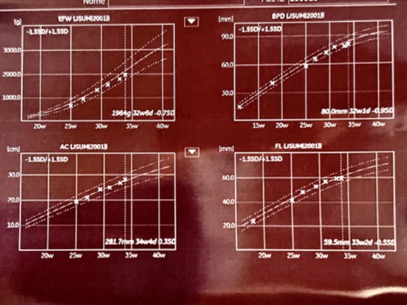 • 毎回:血圧・体重測定・尿検査・胎児超音波検査・胎児エコー(発育、羊水量、胎盤・臍帯異常)